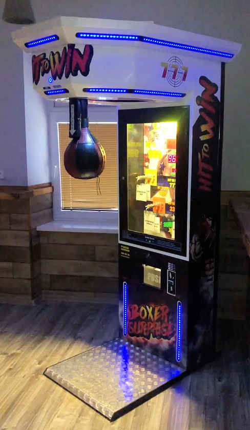 Automat nie len zábavnou formou zmeria silu vašich zákazníkov (súťažiaci sa snažia ukázať na boxovacom automate úderom do boxerskej hrušky svoju silu a získať čo najväčší počet bodov.), ale ocení ich hneď zo svojho “zásobníku” atraktívnych cien.